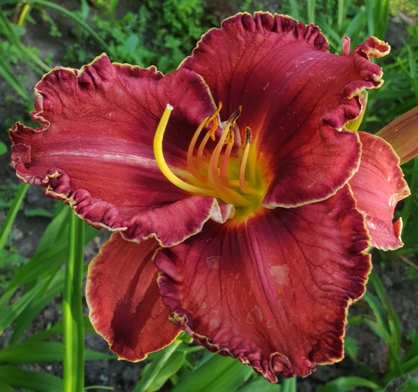 Sarkana ap platu violetsarkanu gredzenu, krokotu apmali un šauru dzeltenu maliņu. Bagātīgi ziedoša šķirne, stungros garos kātos.