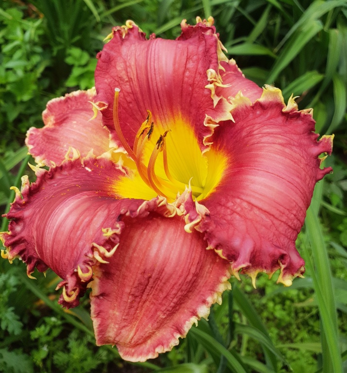 Gaiši sarkanrozā ziedi ar dzeltenām bārkstīm un dzeltenu rīklīti.
