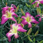 Ziedi ir lieli (diametrs 21,5 cm), purpursarkanā krāsā ar lielu bālganu ūdenszīmi ap dzelteno centru. A - 95 cm